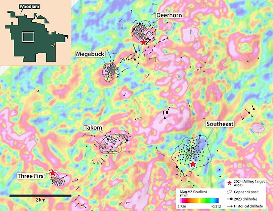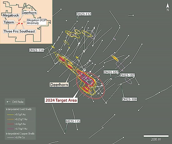 - The Targets: Core drilling will evaluate the potential for: (1) extensions of high-grade gold mineralization at the Deerhorn deposit, (2) extensions of gold-rich copper mineralization at the Three Firs zone, and (3) extensions of higher gold mineralization at the Southeast deposit.