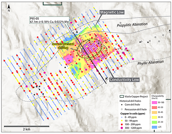 Figure 2. The Thira target area showing gridded IP chargeability data (700m elevation slice) and soil geochemical data (see October 8th, 2024 and January 15th, 2024 News Releases). Drilling will focus on areas showing strong spatial coincidence in geochemical and geophysical data.