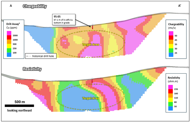 The Thira target is centered approximately 10 km south of the porphyry-related, Poplar copper-gold deposit (Figure 1; historical mineral resources of 152.3 million tonnes at 0.32% Cu, 0.09 g/t Au indicated and 139.3 million tonnes at 0.29% copper, 0.07 g/t Au inferred, Table 13). At surface, the Thira target is characterized by a broad, ~8 by 2 kilometer zone of quartz-sericite-pyrite (phyllic) alteration observed along local road-cuts and sparse outcrop on ridges (Figure 2, see News Release dated August 12, 2024). Zones of strong epidote-chlorite-magnetite alteration locally crop out near the valley bottom, proximal to the strongest geochemical and geophysical anomalies. Recently completed airborne geophysical surveys (MobileMT and high-resolution magnetics) outlined a complex, kilometer-scale conductivity-high cored by a lower-conductivity (high-resistivity) zone associated with a circular magnetic-low (Figure 1). This area is also associated with a moderate chargeability response that increases with depth towards a >50 mv/v anomaly (Figure 3). These geophysical anomalies are mutually coincident with an open-ended, ~1,200 by 800 meter, multi-element (copper-molybdenum-silver) soil geochemical anomaly (see News Release dated October 8th, 2024 and Figure 2). A historical shallow drill hole completed in 1995, near the margins of the strongest coincident anomalies, returned 67.1 meters of 0.18% copper (drill hole 95-05, Figures 2 and 3)1. The percussion drill hole reportedly intersected potassically altered intrusive rocks with quartz-chalcopyrite-molybdenite mineralization throughout its length. The 3D chargeability model suggests that hole 95-05 was too short and was located too far west to test the target area properly.