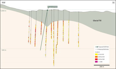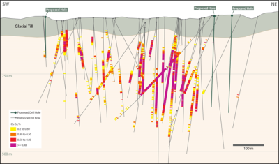 This drill campaign will target high-grade copper/gold porphyry-related mineralization in and around the central corridor of known mineralization at Woodjam (Figures 1 and 2). Targets can be categorized into two groups: (1) deposit extensions and, (2) new target areas. Deposit extensions will be evaluated at the Deerhorn and Southeast deposits. Examples of planned drill hole cross-sections at each of these areas are provided as Figures 3 and 4, respectively. Recent drilling at both deposits by Consolidated Woodjam Copper returned some spectacular results, including 123m of 2.49 g/t Au and 0.4% Cu in 2020 drill hole DH20-071 at Deerhorn, and 142.4m of 0.56% Cu and 0.23 g/t Au in 2021 drill hole SE21-089 at Southeast. The current drill program will evaluate the potential to expand this mineralization.
