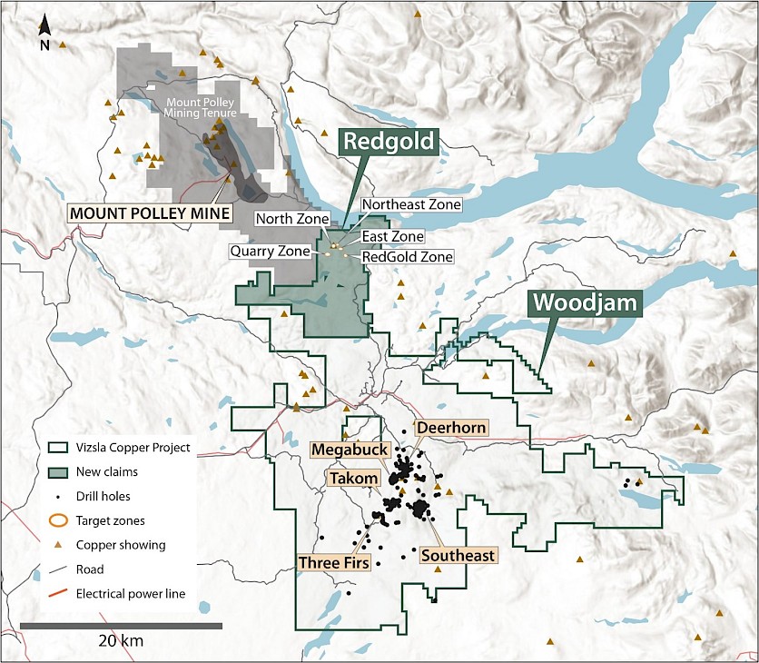 The Redgold Project consists of 58 mineral claims covering an area of 8,278 hectares contiguous with Imperial Metals’ Mount Polley project and Vizsla Copper’s Woodjam project.