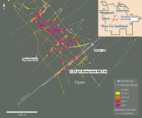 “Drill hole DH24-120 is a great way to start the summer drill program, as it extends the higher-grade gold zone to the south at the Deerhorn deposit,” commented Steve Blower, Vice President of Exploration. “Deerhorn expansion remains a top priority, along with evaluation of other high impact targets at the Three Firs copper-gold zone, the Megaton zone and the higher-grade gold portions of the Southeast deposit.”