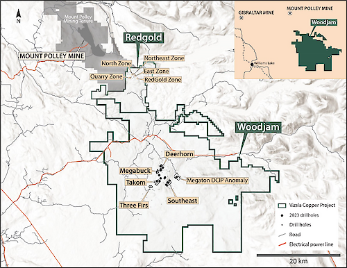 Vancouver, British Columbia, September 3, 2024 – Vizsla Copper Corp. (TSXV: VCU, OTCQB: VCUFF, FRANKFURT: 97E0) (“Vizsla Copper” or the “Company”) is pleased to report the first batch of analytical results from the ongoing summer core drilling program on the Woodjam project (the “Woodjam Project” or “Woodjam”) in central BC (Figure 1). The Woodjam project is home to several porphyry-related copper and gold deposits, including the Southeast and Deerhorn deposits.