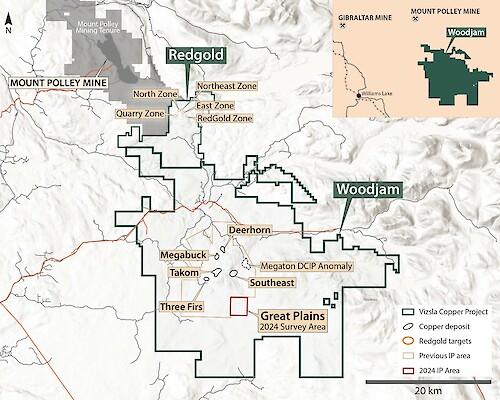 Vancouver, British Columbia, October 30, 2024 – Vizsla Copper Corp. (TSXV: VCU, OTCQB: VCUFF, FRANKFURT: 97E0) (“Vizsla Copper” or the “Company”) is pleased to report results from a direct current induced polarization (DCIP) survey within the Great Plains target area at the Woodjam project (the “Project” or “Woodjam”) in central BC (Figure 1). The Woodjam project is home to the large porphyry-related Southeast copper and gold deposit, plus several other porphyry-related deposits and zones.