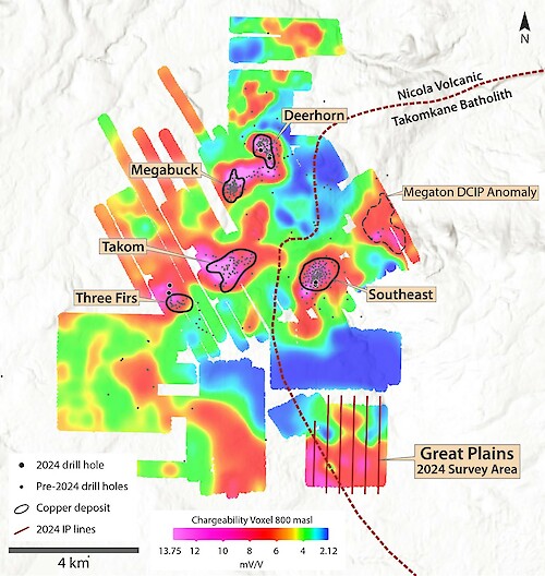 Results from this survey demonstrate the strong prospectivity of the Great Plains area for Southeast-style, porphyry-related copper and gold mineralization. The Great Plains target area has therefore risen dramatically in target rankings across the Woodjam project. Follow-up ground work may include soil and till geochemical surveys, plus infill DCIP surveying ahead of potential drill testing in 2025.