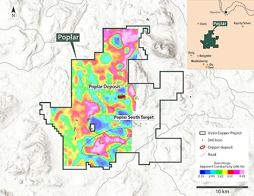 Vancouver, British Columbia, August 12, 2024 – Vizsla Copper Corp. (TSXV: VCU, OTCQB: VCUFF, FRANKFURT: 97E0) (“Vizsla Copper” or the “Company”) is pleased to provide an update on targeting activities at its Poplar South target area on the Poplar project (the “Poplar Project” or “Poplar”) in central BC (Figure 1). The Poplar project is also home to the large Poplar porphyry-related copper and gold deposit.