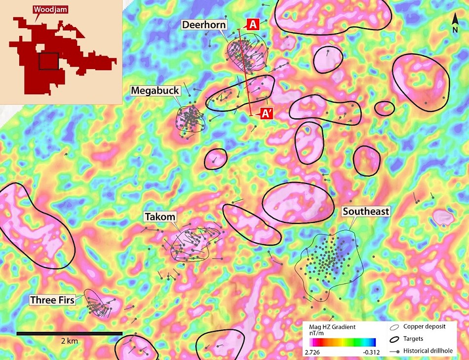 “The recently completed aeromagnetic survey has generated many high priority drill targets,” commented Steve Blower, Vice President of Exploration. “One of the best examples is at the Deerhorn deposit, where recent drilling by the property’s previous owners Consolidated Woodjam Copper has intersected high-grade copper and gold mineralization.”