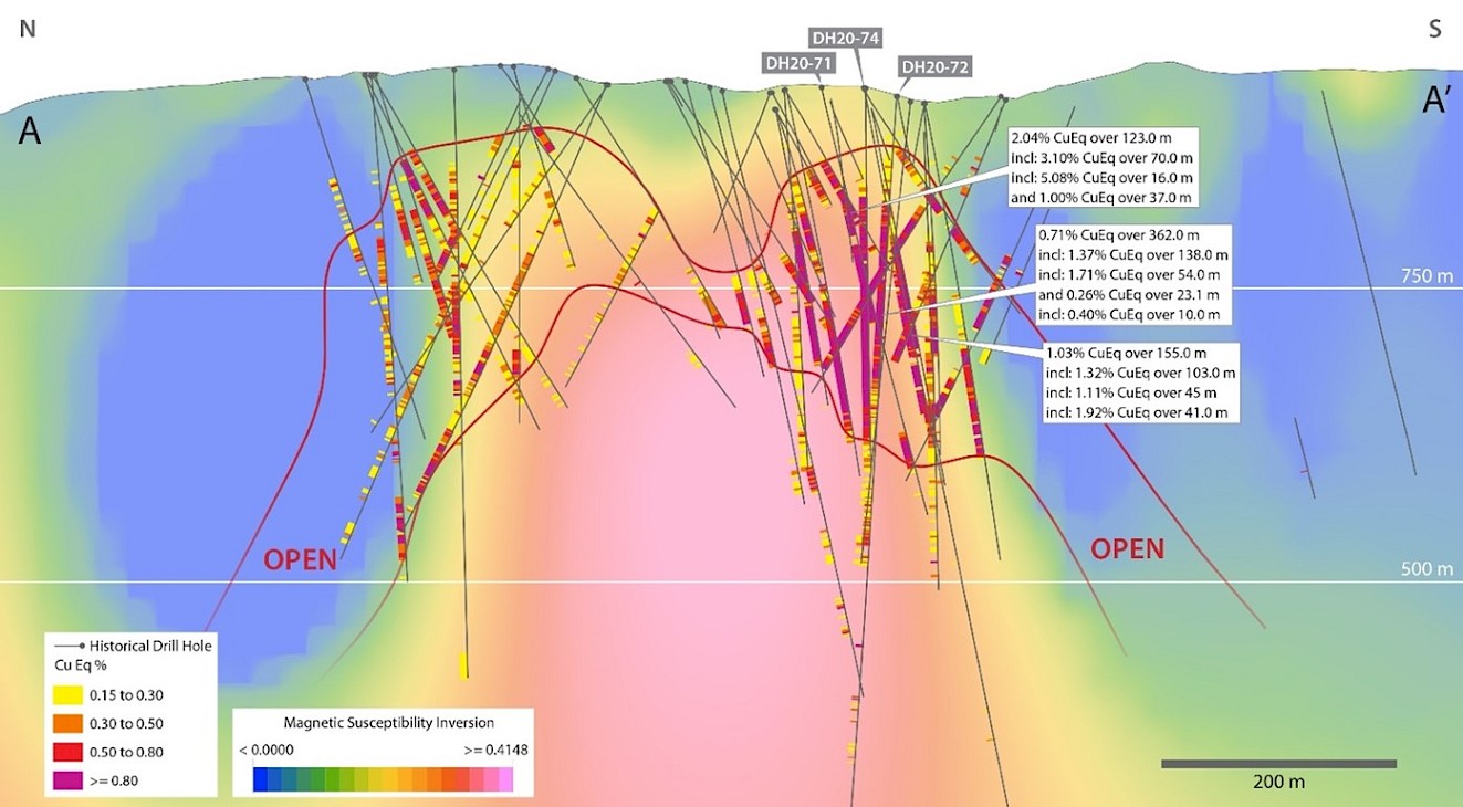 - Extensions to high-grade mineralization: drilling will target extensions of mineralization where previous drilling intersected high-grade porphyry-related copper-gold mineralization (e.g., 123 meters of 2.49g/t Au and 0.40% Cu; DH20-071).