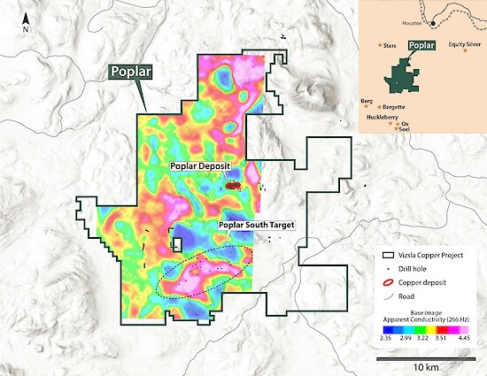 Vancouver, British Columbia, October 8, 2024 – Vizsla Copper Corp. (TSXV: VCU, OTCQB: VCUFF, FRANKFURT: 97E0) (“Vizsla Copper” or the “Company”) is pleased to report results from a soil geochemical survey at its Poplar South target area on the Poplar project (the “Poplar Project” or “Poplar”) in central BC (Figure 1). The Poplar project is also home to the porphyry-related Poplar copper and gold deposit.