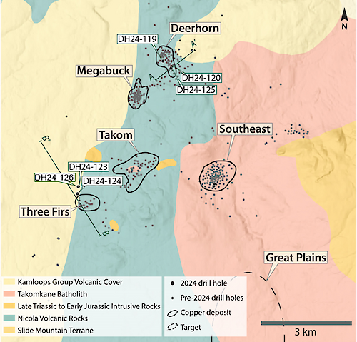 The program successfully accomplished its two main objectives: 1) expand on high-grade porphyry-related gold-copper mineralization at the Deerhorn and Southeast deposits (see September 3rd, 2024 and September 9th, 2024 news releases), and 2) define new exploration targets to be evaluated in future drill programs (Three Firs, this release and Great Plains, see October 30th, 2024 news release).