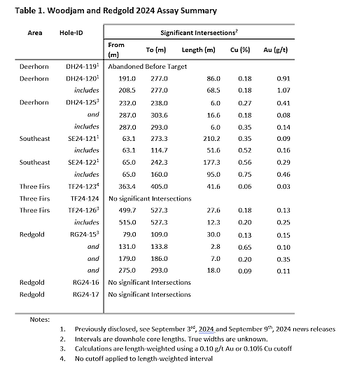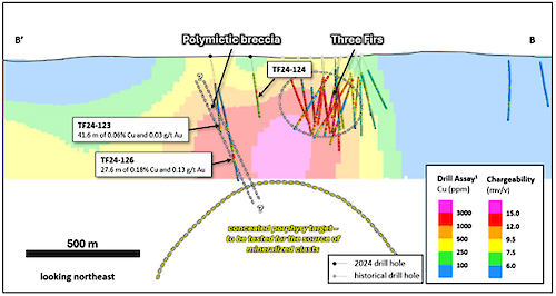 - Drill holes TF24-123 and TF24-126 intersected a new zone of polymictic breccia approximately 500 meters northwest of the Three Firs copper-gold target: