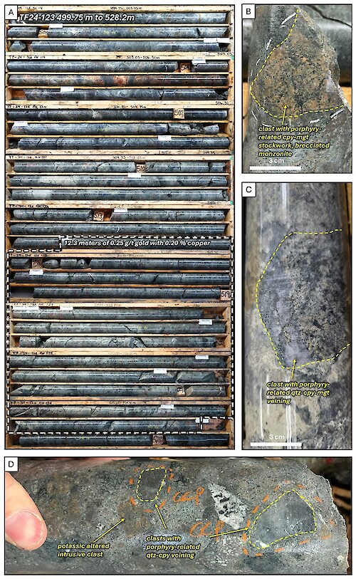 Figure 5. Core photos of the upper breccia zone in TF24-126. A. Box photos showing core from 499.75 to 528.2 meters downhole. An increase in mineralized clasts at 515.0 meters resulted in a 12.3 meter interval of 0.25 g/t gold with 0.20% copper. B. Example of brecciated and potassically altered intrusive clast with fine quartz-chalcopyrite-magnetite stockwork. C. Mineralized clast with quartz-chalcopyrite-magnetite vein. D. Polymictic breccia showing mineralized clasts, potassically altered intrusive clasts, hornblende-phyric diorite clasts, and plagioclase-phyric andesite clasts set in a fine-grained magmatic(?) matrix. Abbreviations: qtz = quartz, cpy = chalcopyrite, mgt = magnetite