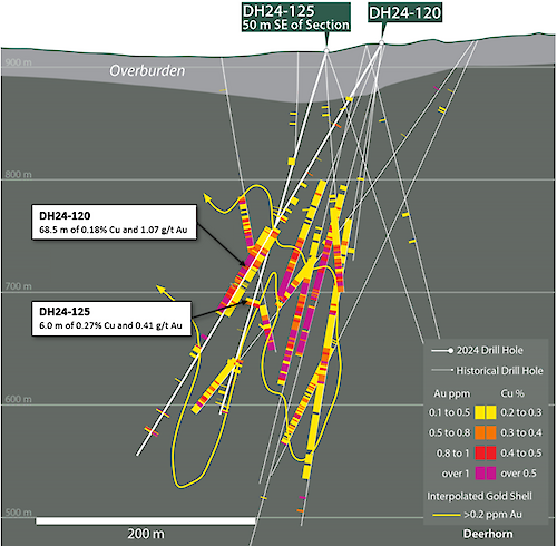 Figure 7. Southwest-northeast section across the southeastern extent of the Deerhorn deposit showing the location of DH24-125 and DH24-120 (previously released). Interpolated gold shell is based on preliminary modelling of current and historical assay data2 and is shown to schematically show the distribution of porphyry-related gold mineralization. Copper results (right side of drill trace) only shown for 2024 holes. Intervals are downhole length-weighted. True widths are unknown. Section width is 90 m.