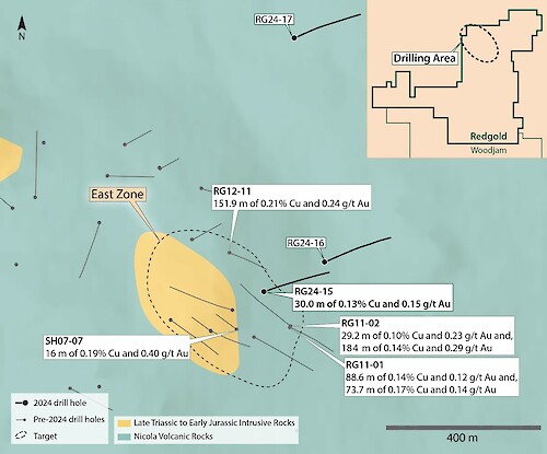 Drilling at the Redgold project, contiguous and immediately north of the Woodjam district (Figure 1), consisted of three holes, targeting the eastern and northern extension of porphyry-related copper and gold mineralization at the East zone target (Figure 8). Hole RG24-15, a 135 meter step-out to the southeast of hole RG12-11 (151.9 meters of 0.21% copper with 0.24 g/t gold3, see May 12th, 2023 news release), intersected numerous intervals of anomalous copper and gold mineralization highlighted by 30.0 meters of 0.15% copper and 0.13 g/t gold. These new drill results together with recently acquired IP chargeability and resistivity data will be interpreted together to refine the Redgold exploration model.