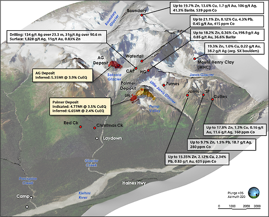 Figure 1: Southwest looking view of the Palmer Project showing the distribution of under-explored high-grade exploration targets. See references below for sources of data.