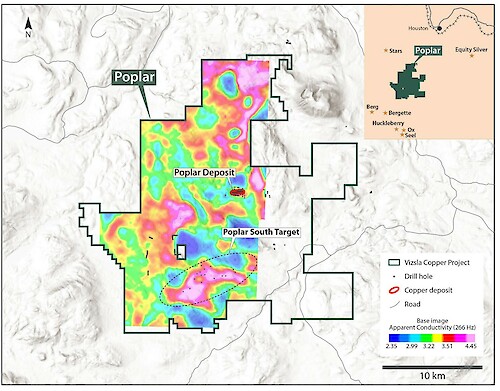 Vancouver, British Columbia, January 15, 2025 – Vizsla Copper Corp. (TSXV: VCU, OTCQB: VCUFF, FRANKFURT: 97E0) (“Vizsla Copper” or the “Company”) is pleased to report results from a recently completed induced polarization (IP) survey across parts of the Poplar South target at the Poplar project (the “Project” or “Poplar”) in northwest British Columbia (Figure 1). The Poplar project also hosts the porphyry-related Poplar copper and gold deposit (Table 1).
