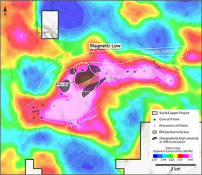 - Direct Current Induced Polarization (DCIP) ground geophysical survey identified a strong IP chargeability anomaly
