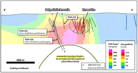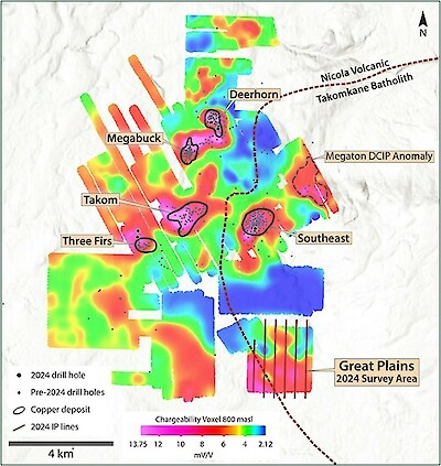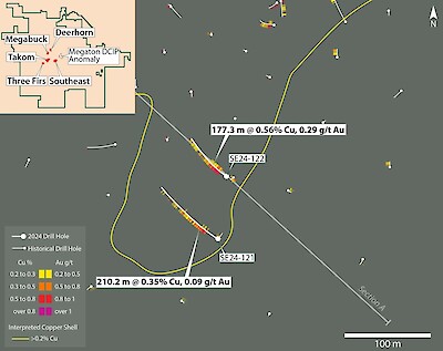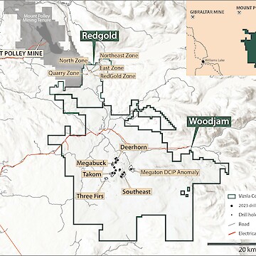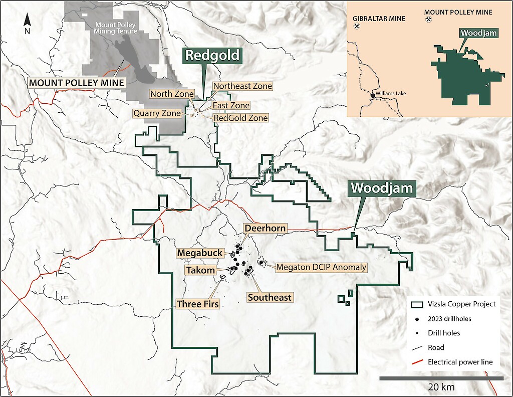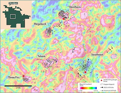 To date, six zones of porphyry mineralization (Megabuck, Deerhorn, Takom, Three Firs, Southeast, and Megaton) have been identified at the Woodjam Project by drilling (95,092 meters in 281 holes since 2009 and a further 114 holes, 30,092 meters predominantly from 1998). These six mineralized zones form a cluster approximately 5 kilometers in diameter. The Megabuck and Takom Zones were occurrences documented previous to 1998 but largely untested until after 2003 while the larger Southeast Zone and Deerhorn Zone were discovered in 2007 and 2008, respectively. In 2012, the Three Firs Zone was discovered and in 2012 the Megaton Zone was discovered. Historical mineral resource estimates are summarized in the table below.