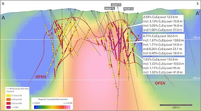 Much of the drilling and other exploration work on the property was completed by Gold Fields Ltd. under Joint Venture agreements with the historical property owners until Gold Fields sold their interest to Woodjam Consolidated Copper Corp. in 2015. Only a limited amount of drilling has been completed since that time, but the most recent results from 2020 and 2021 are spectacular. Highlights are summarized in the table below.